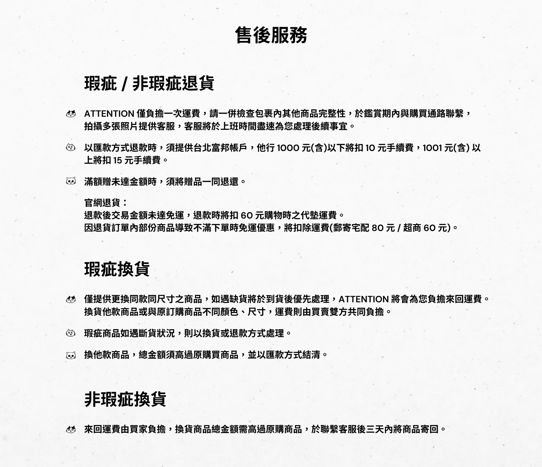 ATTENTION將退款退貨商品金額 扣除運費 ( 超商$60 / 郵寄$80 ) 之金額。