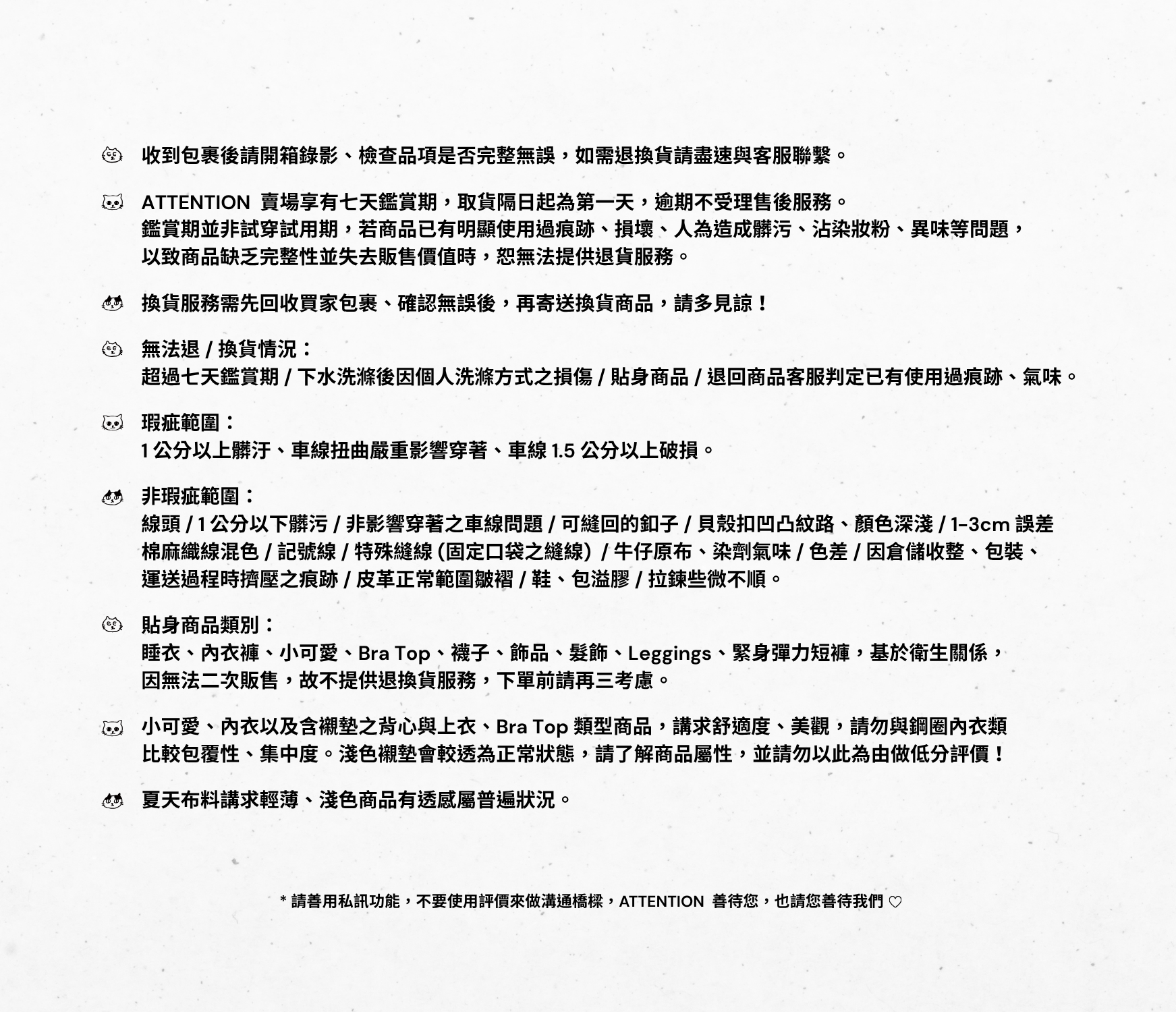 (商品務必保持全新未下水狀態,若有任何污漬、損壞,則不接受退換)