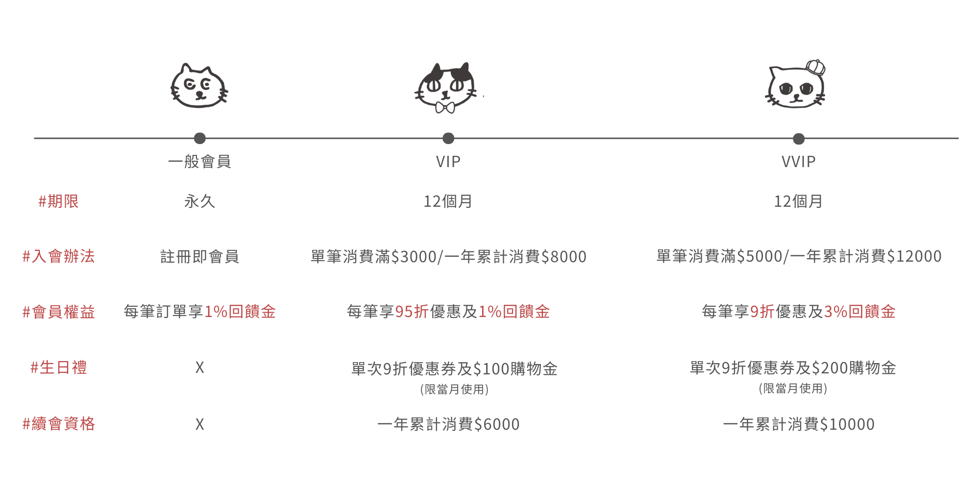 ◆ 達成會員升級時的訂單金額,並不會計算於續會的指定金額內。 在續會之後,續會日先前的消費無法納入下一次升級會員等級的消費累積。